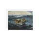 Un homme solitaire dans un petit bateau navigue sur une mer agitée, entourée de requins menaçants. La scène océanique dramatique transmet tension et survie au milieu de la puissance de la nature. Artiste : Winslow Homer