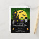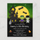 Cette invitation d'anniversaire amusante et éffrayante présente de mignons monstres Frankenstein à côté d'une maison hantée. Dans l'arrière - plan est une pleine lune avec des chauves-souris et un ciel de nuit vert avec des étoiles. Le texte combine les polices décoratives et serif pour un look élégant et moderne. C'est parfait pour Halloween.