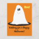 Image colorée représentant un fantôme doux et souriant avec de grands yeux noirs amicaux. Le fantôme indique boo qui apparaît dans le texte jaune. Le fantôme en forme de lobby blanc se dresse sur un point noir et la carte est orangée d'un arrière - plan. Texte en noir : "Je vous souhaite une heureuse Halloween." Commandez une carte ou plusieurs fois à la caisse.