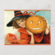 Cette douce carte postale d'Halloween a une jolie reproduction de l'illustration vintage d'une petite sorcière tenant une lanterne de valet souriant et le mot Halloween.