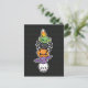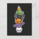 Carte postale avec un joli modèle d'halloween d'un crâne, chauve-souris, citrouille, araignée, bonbons et maïs-bonbons.