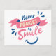 Éclairez la journée de quelqu'un avec cette amusante carte de devis rose et bleu joyeux. L'attitude joyeuse de la citation "N'oubliez jamais de sourire" est imprimée en fontes rose et bleue amusante avec une bannière rose et un visage heureux. Les jolies cartes smiley sont parfaites pour * salutations - bonjour, pensant à vous, amour, vous manquez, obtenir bien, anniversaires * entreprises * mariages et fêtes * cadeaux de papeterie - cravate un joli ruban autour de quelques cartes. Faites défiler vers le bas pour voir les produits correspondants que vous pouvez apprécier.