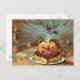 Joyeux Jack-o-Lantern est assis sur un gâteau. Les sorcières et les diables volent au-dessus. Design de dessin animé vintage.