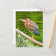 Un oiseau avec un long bec est perché sur une rampe métallique, à côté d'une clôture à chaîne et de verdure, avec un plan d'eau serein dans l'arrière - plan. La scène est vibrante avec le feuillage luxuriant et les reflets dans l'eau.