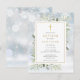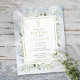 Doté de délicats feuilles de verdure aquarelée sur un arrière - plan de gel hivernal et d'un élégant crucifix en or, ce baptême ou invitation à baptiser chic neutre genre peut être personnalisé avec vos informations spéciales, avec un arrière - plan de sauge argent au verso. Conçu par Thisisnotme©