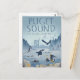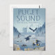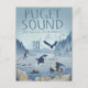 Profitez de cette illustration de style affiche de voyage de vues emblématiques de la VAN - y compris le pont Tacoma Narrows, le Mont Rainier, et diverses espèces sauvages aimées comme Orca, Otter, Hérons, Kingfisher, Bald Eagle, Purple Starfish, Seals, Crabs et Anemone. Nous l'aimons ici en plein air !