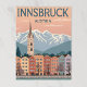 une affiche vectorielle vintage d'Innsbruck, montrant les maisons de ville colorées devant les Alpes enneigées. Vous y trouverez un clocher d'église, des arbres d'hiver et des gradients de ciel pastel. Utilisez des remplissages de couleurs plates aux tons vintages : corail, bleu alpin et beige. "INNSBRUCK" en majuscules, police rétro centrée en haut, "AUTRICHE" en dessous en serif plus petit.