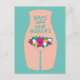 La carte postale de la manifestation Pro Choice présente une illustration du corps de la femme avec des fleurs et un texte "interdit de notre corps" sur un arrière - plan aqua.