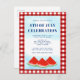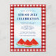 Famille Invitation et amis à votre fête avec cette carte postale Invitation 4 juillet. Il est décoré de pastèques aquarelles et d'un ciel bleu sur un arrière - plan de buffles rouge et blanc. Facile à personnaliser. Cette invitation festive est parfaite pour n'importe quel thème de célébration du quatrième juillet. Utilisez l'outil de conception pour modifier la taille, le style ou la couleur du texte. Parce que nous créons notre oeuvre, vous ne trouverez pas cette image exacte d'autres designers. Aquarelle originale © Michele Davies.
