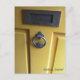 Une simple porte jaune avec un clic de porte traditionnel irlandais Claddagh et une fente de courrier. Photo prise à Galway, Irlande. Carte postale appropriée pour envoyer une simple note à un ami ou à un proche.