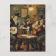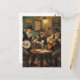 Une carte postale vintage de musiciens dans un pub irlandais traditionnel qui capte une scène chaleureuse et animée de musiciens jouant de la guitare, des banjos et des énigmes, le tout baigné par la douce lueur des bougies et du bois vieilli.