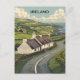 Une carte postale vintage d'Irlande présente des champs tranquilles, des cottages pittoresques et une mer calme, le tout dans des couleurs chaudes et nostalgiques.