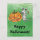 Un opossum gai tient une allumette et pose à côté d'un jack-o-lanterne éclairé avec un sourire tout aussi gai. Ce dessin d'Halloween est en aquarelle et encre.