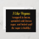Le dicton drôle sur cette carte postale anti-végétalienne dit en gros caractères gras : "J'aime les Vegans." Puis, en lettres plus petites, la punchline dit : "enveloppé dans du bacon, saupoudré de sucre brun et cuit jusqu'à ce que le sucre soit mousseux." Mmmm... savoureux, n'est-ce pas ? Tout est en plaisantant, et le proverbe irrévérencieux sur cette carte postale va certainement faire rire les destinataires, végétaliens ou non. Est-ce une carte postale offensante ? Pas si vous avez un sens de l'humour. Prenez un tas ; le rire aide à se débarrasser de toutes les toxines que nous mangeons.