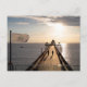 Quai au coucher du soleil - Carte postale. Photo de Clevedon Pier à Somerset, Angleterre, Royaume-Uni. coucher du soleil d'été, vue sur la mer et le long de la jetée, avec des gens silhouettes marchant sur la jetée et un drapeau flottant. Carte postale Clevedon Pier