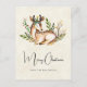 Carte postale de Noël avec un joli cerf posé au milieu d'une flore feuillue. Style Boho rustique.