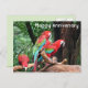 Carte postale d'anniversaire aux perroquets rouges, verts et bleus. Un anniversaire est un jour à célébrer, à se souvenir, au trésor...et surtout, espérer l'amour et le bonheur dans le futur...