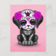 Ce joli design est orné d'un petit chiot noir décoré avec le Jour des motifs morts. Des roses violets apparaissent dans les oreilles des chiens tandis qu'une étoile à cinq points est assise au milieu du front. Le visage du chiot noir est peint en blanc et décoré de tourbillons et de motifs de points dans la tradition du Jour des crânes de sucre morts. Des os blancs et une cage thoracique apparaissent sur le corps du chien, ce qui lui donne un aspect squelette. La tête surdimensionnée et le petit corps ainsi que les détails de la fourrure créent une belle combinaison d'un dessin animé et d'un look réaliste. Ce chiot unique et adorable est un adorable design Day of the Dead.
