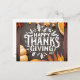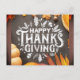 Une image sur le thème de Thanksgiving présente un fond gris foncé orné de lettrage de style craie blanche qui lit "HAPPY THANKSGIVING". Le texte est stylisé avec des fioritures et des éléments décoratifs tels que des feuilles et des glands. Autour du texte central se trouvent divers éléments automnaux. À gauche, il y a une citrouille jaune pâle, et en haut à droite, une tranche de tarte à la citrouille. Des glands et des feuilles en nuances d'orange, de jaune et de marron sont dispersés autour, contribuant à l'esthétique de l'automne. L'image est encadrée par une bordure qui passe du brun foncé à une teinte plus claire, offrant profondeur et contraste. La composition globale est festive et évoque l'esprit de la fête de Thanksgiving.
