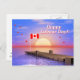 Carte postale de la Joyeuse Fête du Travail d'une scène de lac d'été avec un quai, coucher du soleil et le drapeau canadien.