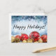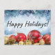 L'image représente un arrière - plan enneigé avec des guirlandes et des pinecones accrochés au bord supérieur de la carte, des ornements rouges et or au fond et l'expression "Joyeuses fêtes" au milieu.