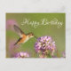 Cette superbe carte postale de colibri présente une belle photo d'un colibri roux sirotant du nectar d'une fleur de abeille de montagne rocheuse avec le message "Joyeux Anniversaire". Photographie créée par la photographe primée Maria Jeffs.