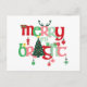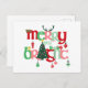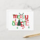 Joyeux et lumineux Noël en lettres rouges et vertes avec des ornements rétro, un arbre de Noël et des bois.