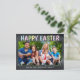 Photo moderne Carte postale de Pâques. Le design présente un script de typographie coloré ''Happy Easter'' en couleurs pastel printanières, photo de famille et ligne simple avec un nom de famille sur l'arrière - plan de texture du tableau noir. Personnalisez davantage avec votre message à l'arrière.