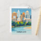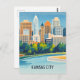 Affiche de voyage de style vintage présentant l'emblématique horizon de Kansas City. L'image présente le skyline distinctif de la ville, L'affiche est conçue dans un style rétro avec une palette de couleurs vibrantes et une atmosphère nostalgique.