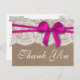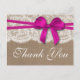 La collection rustique arc rose est un design étonnant avec un bel arrière - plan rustique effet burlap avec une coupe romantique vintage effet dentelle blanche finie par un ruban rose foncé avec arc. Ces cartes postales peuvent être personnalisées pour votre occasion spéciale et feraient le carte de remerciements parfait pour n'importe quel mariage, douche nuptiale, fête de fiançailles, fête d'anniversaire et bien plus encore. *Veuillez noter que Zazzle ne vend que des cartes postales imprimées afin que ces cartes postales de remerciement n'aient pas de matériel de burlap, dentelle ou ruban.