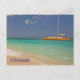 Un cadre paisible et relaxant sur une plage tropicale à Grenade avec le surf qui surplombe la plage et un catamaran amarré dans les eaux cristallines.