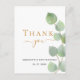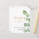 Un carte de remerciements pour un 50ème anniversaire (ou tout âge). Un arrière - plan blanc chic décoré de verdure d'eucalyptus. Sur l'avant, script écrit et texte : Merci, votre texte, titre et une date. Texte de couleur dorée et noire. Retour : Personnalisez et ajoutez Votre note de remerciement et votre nom.