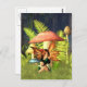 Jolie fée assise par des champignons de bois ou des tabourets et fougères dans un vitrage de forêt ensoleillé, illustration numériquement rendu 3d