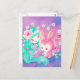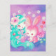 Mignonne chibi fille avec des cheveux turquoise fluides, affectueusement moussant son lapin rose animal.