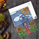 Image de mon dessin original au crayon couleur. Cette peinture d'art populaire a une femme habillée en rouge debout à côté de deux grands tournesols jaunes. Le soleil est au-dessus, souriant. Deux nuages surréalistes flottent au-dessus de son coeur rouge qui souffle sur le sol. Voir mon magasin Art by MAR pour apparier les produits avec ce design.