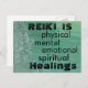 L'éclatement de l'eau peut être symbolique des guérisons reçues par Reiki. Cette carte peut être utilisée pour les invitations à la formation ou pour leur rappeler un rendez-vous. La couleur de l'eau est très calme. Les mots : REIKI IS physique, mental, émotionnel et spirituel Les guérisons sont imprimées en noir. On veut certainement l'équilibre et se sentir bien dans tous ces domaines.
