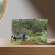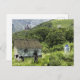 Une machine à remonter le temps se matérialise par la cabane d'un paysan médiéval. Un château est au loin. Tableau de Susannah Keegan