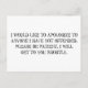 "Je voudrais présenter mes excuses à quiconque que je n'ai pas offensé. S'il vous plaît, soyez patient, je vous contacterai sous peu" en vintage, lettre affligée