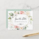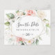 Ce feuillage d'or géométrique horizontal enregistrer la date carte postale est parfait pour un mariage rustique. Le design se compose d'un feuillage botanique vert et or peint à la main, avec des fleurs roses, rousses et blanches, qui ornent un cadre géométrique élégant.