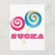 Deux sucettes bleues et roses se croisent. Texte : Sucka.