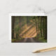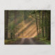 Cette photo présente des rayons lumineux qui traversent le brouillard et illuminent les sapins et les cèdres sur un chemin de terre.