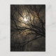 Cette carte postale présente un ciel mystique nocturne. L'air est imprégné de brume. La pleine lune qui brille à travers les arbres illumine les nuages brumeux dans les tons or, jaune orange, blanc et marron et forme un motif abstrait intéressant.