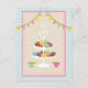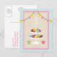 Une invitation à la carte postale d'anniversaire avec l'illustration d'un macaron français et de deux tasses de thé au citron. Bouton au sommet. L'Arrière - plan est en vichy bleu. Personnalisez tout le texte.