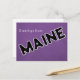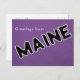 Lettres noires et blanches sur une carte postale violette du Maine. Modèle d'adresse de retour fourni à l'envers. Bonjour du Maine.