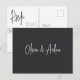 Conçu pour correspondre à nos invitations de mariage de Script manuscrit moderne. Une belle conception typographique avec une atmosphère minimaliste, avec un script moderne doux noir manuscrit et des lettres serif classiques. Personnalisez avec votre RSVP de choix de date et de repas ou de sélections d'entrées.