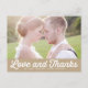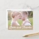 Donnez à vos cartes de remerciement une touche amusante et nostalgique avec ce carte de remerciements de mariage photo horizontal personnalisé. Conçue avec une typographie "amour et merci" d'inspiration rétro sur votre photo mariage préférée, cette carte allie charme vintage et personnalisation moderne. Ajoutez votre photo, vos noms et un message personnalisé pour créer un remerciement élégant et mémorable pour vos invités. La disposition horizontale offre une sensation propre et contemporaine tout en soulignant votre moment particulier. Parfait pour les mariages à thème vintage ou les couples qui aiment une esthétique ludique et rétro, cette carte permet de partager facilement votre appréciation d'une manière qui se sent personnelle et unique.