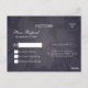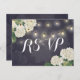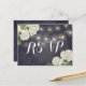 Mariage RSVP Répondre Modèles de carte postale - Elégante Fleurs d'Hydrangée Blanche et lumières à cordes sur Vintage Navy Blue Floral Linen Arrière - plan. Un design parfait pour votre grand jour. Tous les styles de texte, couleurs, tailles peuvent être modifiés selon vos besoins !