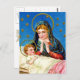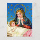 Illustration religieuse vintage montrant Marie priant à côté du Bébé Jésus pendant qu'il dort. Chacune dispose d'un halo autour de la tête et le cadre est une nuit étoilée. C'est parfait pour une carte postale de Noël. Images HTM
