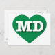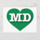 Cette carte postale est dotée d'un coeur vert vif contenant les lettres coques supérieures MD, gras, blanches, l'abréviation officielle du Maryland, l'état de l'ancienne ligne. Le verso de la carte postale est vide, en attendant votre texte customisé ou vos sentiments manuscrits.