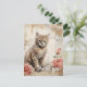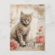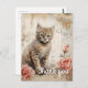 Un chaton tabby duveteux aux yeux bleus saisissants est assis à côté de deux roses roses sur un fond comportant des écritures vintage et des taches d'encre. Les tons sépia donnent une sensation chaude et antique à la composition, qui combine des fleurs et un sujet animal mignon.